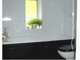 splash guard. A handbasin and large mirror are lit with a vanity light with a main light and extractor in situ.